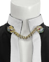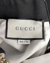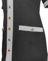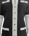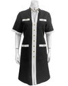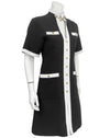 Resort/Spring 2019 Gucci black and white day dress by Alessandro Michele, styled in a retro 1960's archival look. The Mod silhouette features high contrast white trim against the black body with gilt metal chain detail at the neck. Gilt metal buttons down the front and on the pockets are enhanced with colored glass and rhinestones. This dress represents the height of the mood created during the tenancy of Alessandro at Gucci; high fashion, high luxe. Fabric is 50% wool, 50% cotton. Dry cleaned and ready to wear. Fits like a US size 2-4.