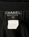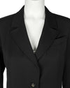 Chanel 97P black mid-weight wool long style single breasted blazer with logo button. Elegant equestrian style fitted through the waist, long blazer lined in silk. Flat lying notched collar, single black resin button with gilt metal CC logo. Two low set flap pockets, two invisible inside snaps down the front interior to secure the jacket when closed. In excellent vintage condition with no unusual signs of wear. Size 36 French fits like a US 2. Dry cleaned and ready to wear.