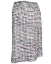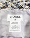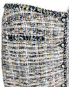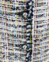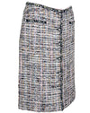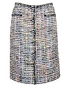Chanel 2004 Spring collection bouclé A-line skirt. Black and white tween with hints of pink, yellow blue and orange woven through the fabric, finished off with a black and white fringed trim around the waist, on the faux hip pockets and down the front with lucite CC logo buttons.