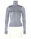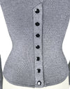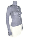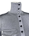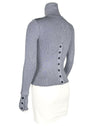 The sweater features a high funnel neck that fastens with a column of glossy black snap buttons, continuing down the front placket. Additional buttons trail down the back spine and sleeve cuffs, creating an armor-like symmetry that became emblematic of Ghesquière’s “sci-fi utility” aesthetic. A single asymmetrical breast pocket and shoulder epaulettes emphasize the structured silhouette.